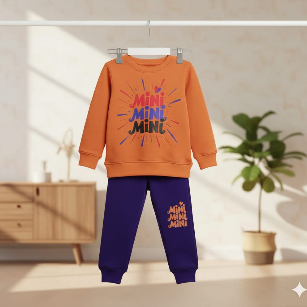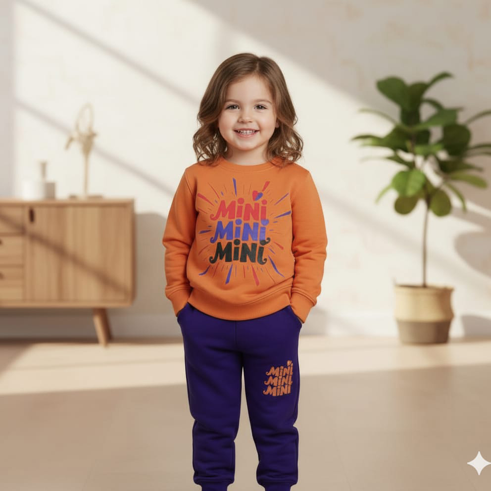 Bright, bold, and full of joy — the Florax Mini Orange “MINI MINI MINI” Sweatshirt adds fun to every outfit. Designed with vibrant typography and a splash print, this cozy fleece top brings color and personality to your child’s wardrobe.